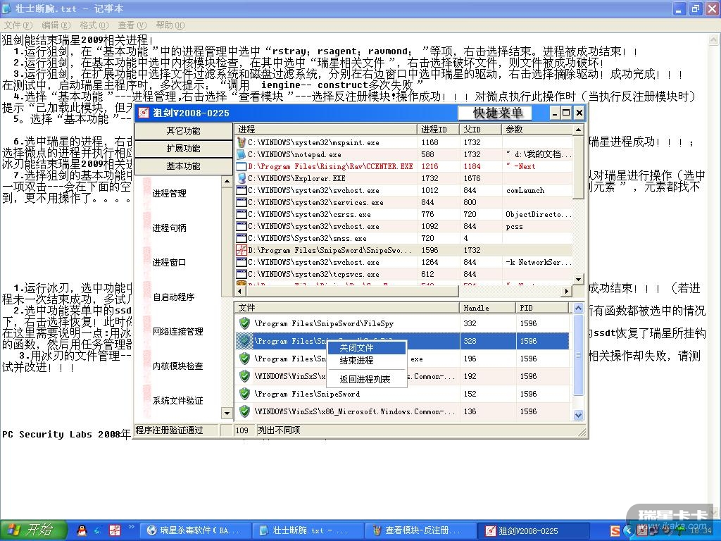 选中瑞星的进程,右击选择查看打开的文件,--选中打开的文件,对瑞星操作(关闭文件),狙剑没有任何提示,说明打开瑞星进程成功!!!;选择x的进程并执行相应的操作-----关闭文件会提示“打开进程失败,请恢复进程的hook”,