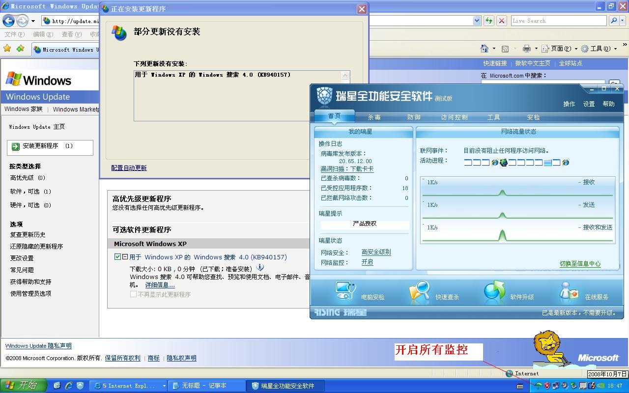 问题现象:操作系统更新到最后留下Windows 搜索 4.0 (KB940157)无法更新,但将瑞星全功能安全软件2009测试版所有监控功能禁用后,就可以更新了。随后我又将其卸载,重新开启所有监控,还是无法更新。