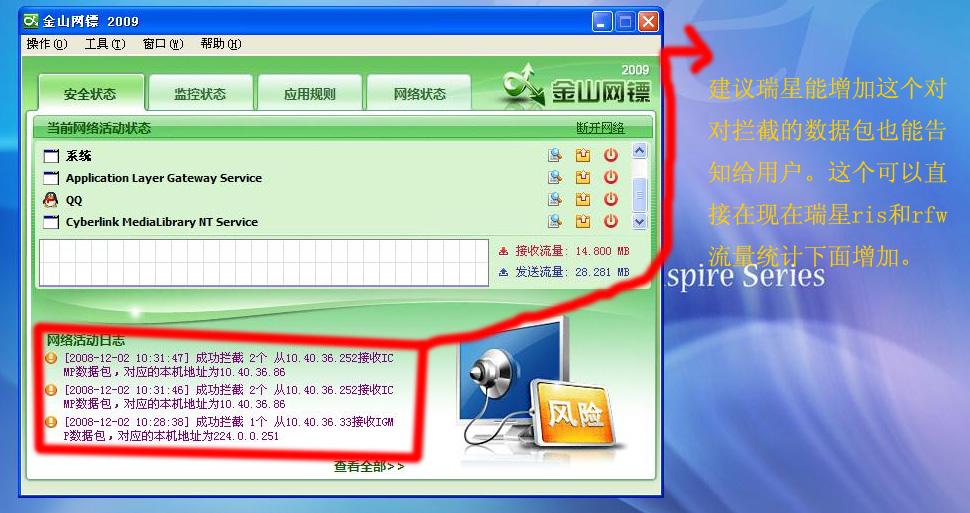最近金山09上市了,我在测试他发现金山有一些地方值得瑞星去学习和改进的,希望瑞星公司能采纳,谢谢!1、升级窗口的图片。瑞星在升级后的安装边上的图片不够好看,因为现在都vista了,用户对也在追求外观的漂亮提升审美。从细节体现瑞星的专业和认真。金山的升级图片,个人建议可以将这种风格放在瑞星升级安装界面