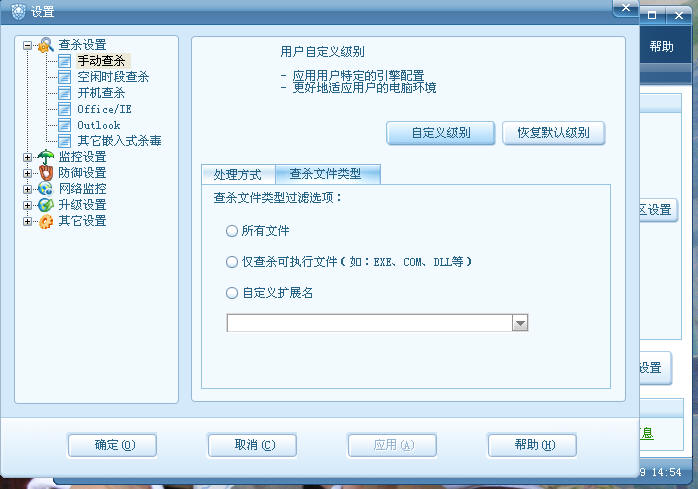 不能设置查杀文件类型!处理方式是发现病毒提示我不能改变选择!!
