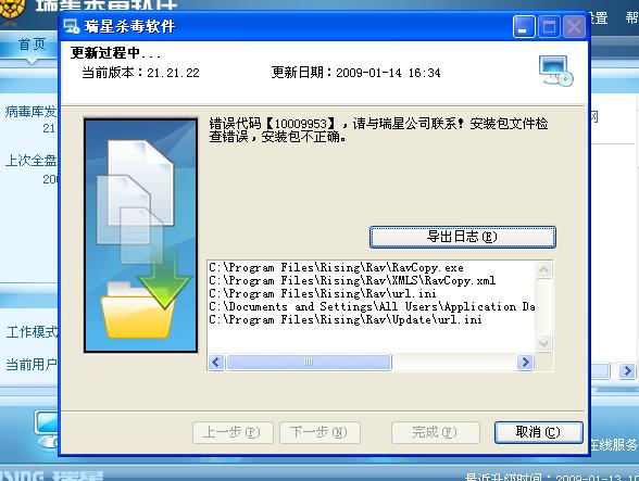 升级到09版本后,一升级就发现“瑞星通用库(SETTINGS)”错误,错误代码是10009953,显示安装包文件检查错误,因而不敢升级,担心杀毒软件瘫痪,请解决。
