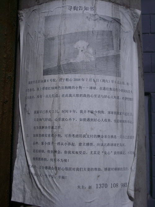 《寻鸟》  拍摄地点:东直门附近。在北京拍了很多寻物启事,本帖的第一张图是寻骡子,这张是寻鸟,北京人爱养鸟,养猫养狗也很多。下面我会陆续贴上寻猫寻狗的。大家可以看看寻物启事里面的北京。电话号码能看全的我都做了模糊处理。