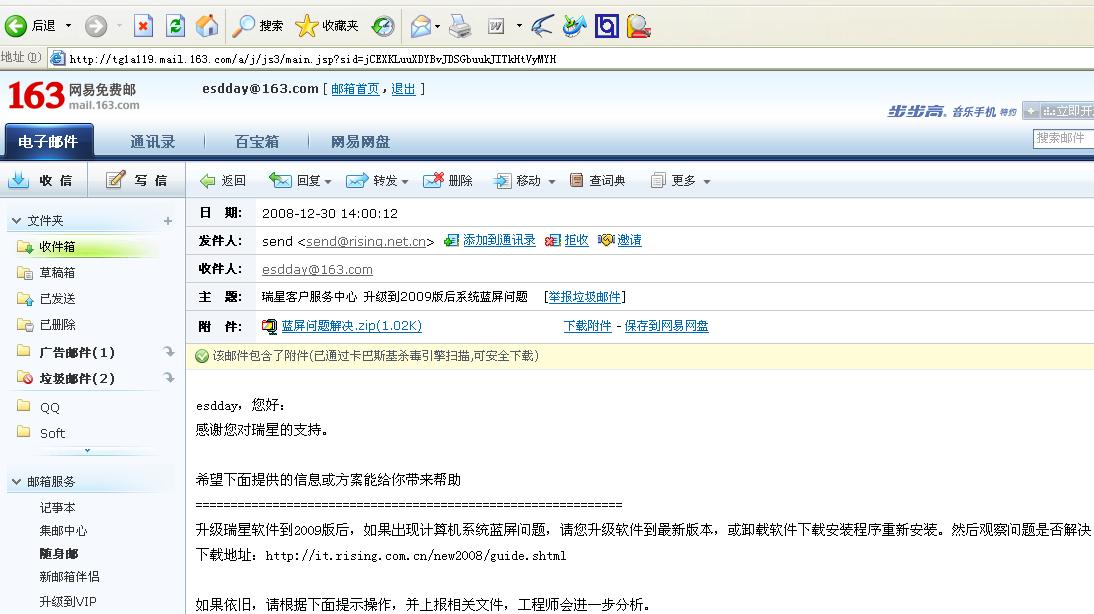 回复:安装瑞星2009后进入安全模式蓝屏!