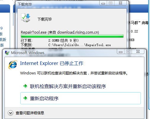 下载完成就会出现系统错误! ie已停止工作,如果关闭 使用OFFICE/IE 镶入杀毒!那么下载正常!