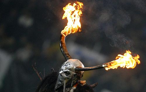 37.November 12, 2008. 一名男子在奥地利足球联赛中穿着传统 Perchten 服装(全身看起来像是 wow 里的萨特)