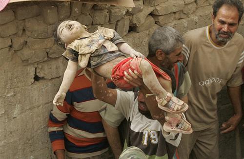 38.April 29, 2008. 一名男子在巴格达萨德尔城空袭后把一个儿童的尸体运出毁坏的房屋