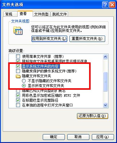 双击“我的电脑”---工具---文件夹选项--查看,然后按下图设置一下,完成后点“确定”;然后再打开一次,如果设置又复原成修改前的,那就是被病毒恶意修改了有关注册表键值: