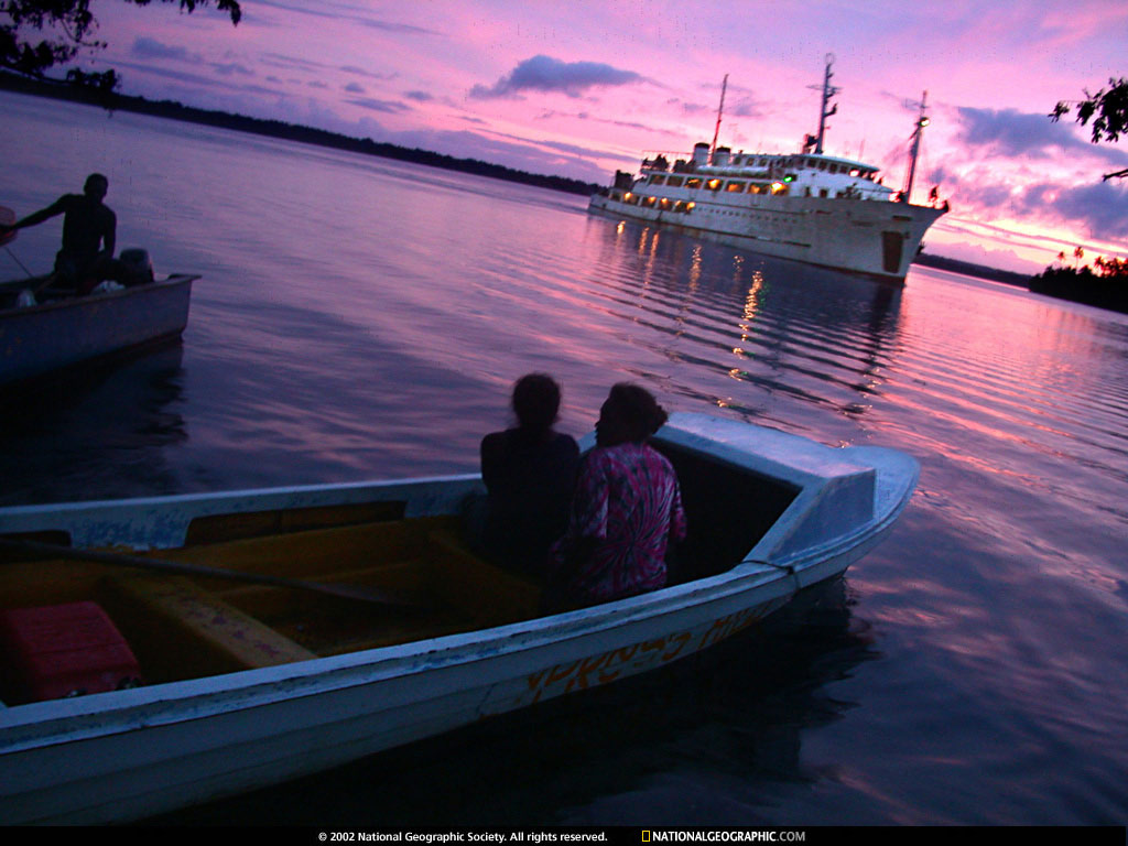 离新发现的约翰·F·肯尼迪PT-109号残骸处不远的地方,一艘渡船驶入科隆班加拉岛的林吉考夫(湾)。