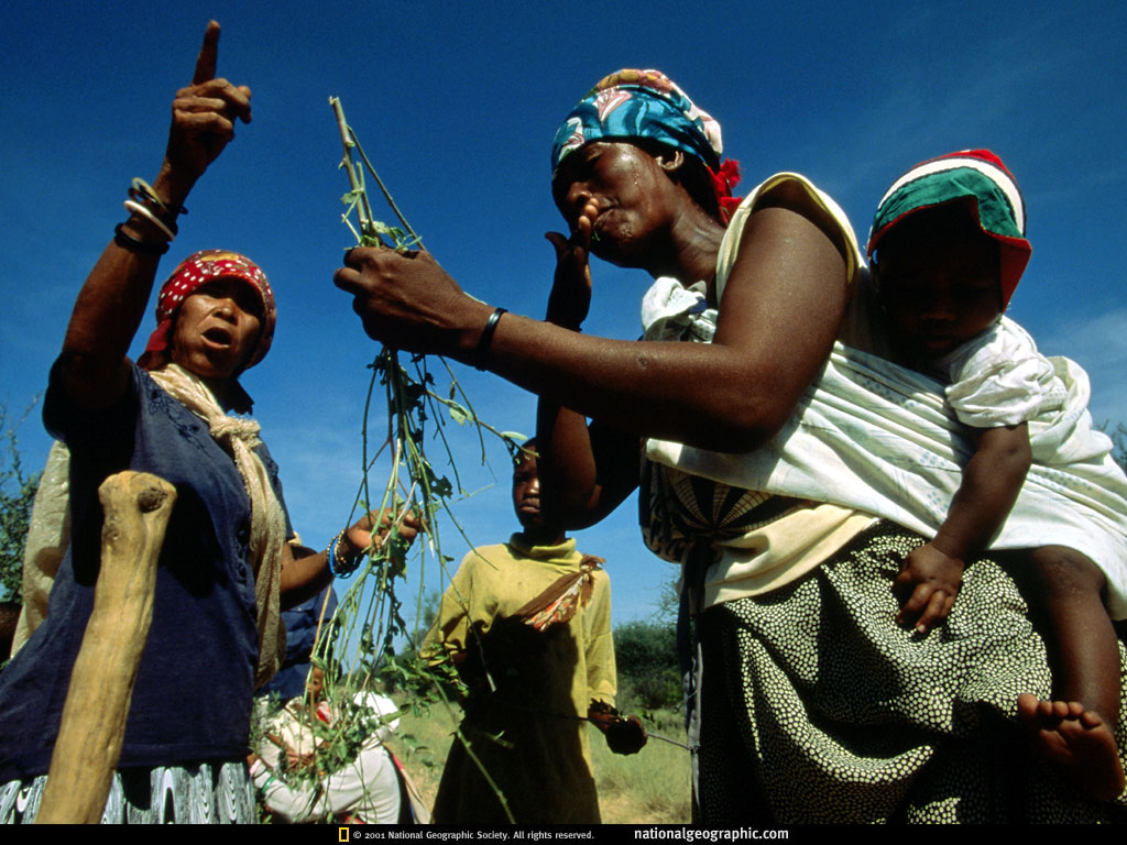 博茨瓦纳共和国杭济附近的妇女雇农依旧进入灌木丛闲聊和吃些野生植物小吃。这里聚集的野生食物曾经提供了70%布须曼人的食粮,但古老的灌木丛林地被改变成畜牧大农场。如今政府救济提供了大部分当地人的食物。