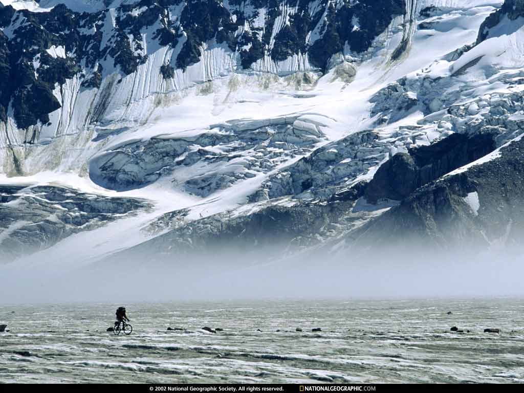 图为一位自行车手穿越大自然的壮丽舞台(骑者卡尔·托宾在Black Rapids Glacier那不平坦的冰面上骑过)。骑车的人被风和细沙阻碍着在冰上直行了十个小时。这个小组总共完成了70%的骑车旅行计划。