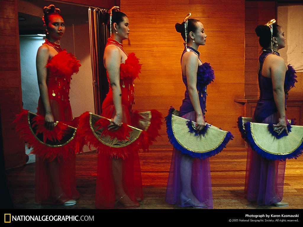 在培养海外艺人的受训课上,菲律宾姑娘例行公事的排成一行练习舞蹈。每天的课程教授姑娘们唱歌、舞蹈以及怎样微笑。训练方案将给她们提供在俱乐部(一般是日本的俱乐部)里的工作,还将给她们签证,并且对她们的福利及住所进行监视。