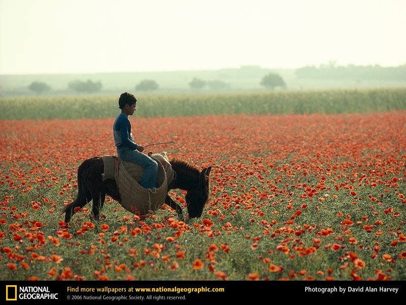一位小伙子没有什么特别的事情而又匆忙让它的驴子去吃草在那片野生的深红色罂粟花地,有时他们又蹒跚地走独自到田野劳动。那里靠近伊斯兰教的圣地――凯万(突尼斯东北部城市)。