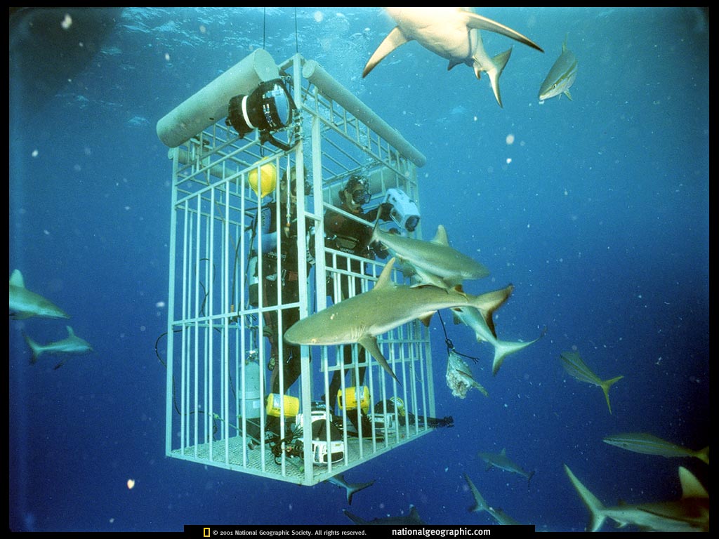 安全关在笼子里的摄影师比尔·克钦格和他的助手埃里克·海因在灰礁鲨靠近他们的时候用遥控装置給自己拍照。