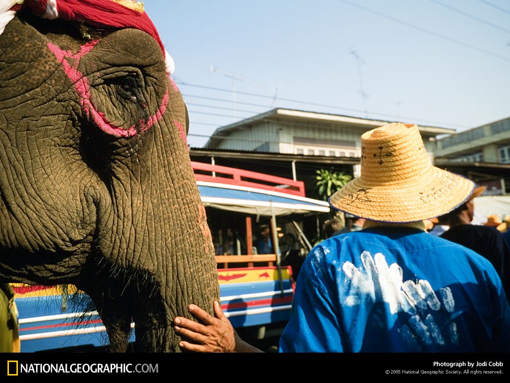 一头粉饰着庆典时所用色彩的大象,正参加为迎接新来的佛教僧人而举行的仪式。这种典礼每年四月份在泰国的素可泰举行。
