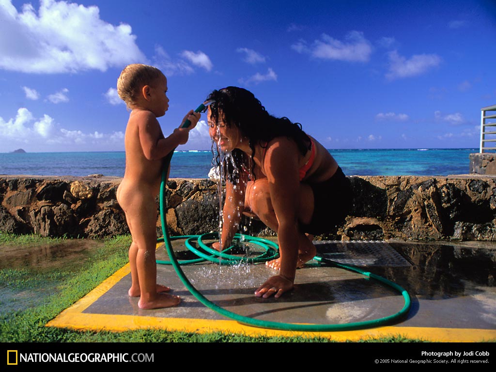 一位女子和小孩在威马纳洛冲洗身体。这个被郊区和白沙滩环绕着的城市距火奴鲁鲁(美国檀香山)半小时车程。