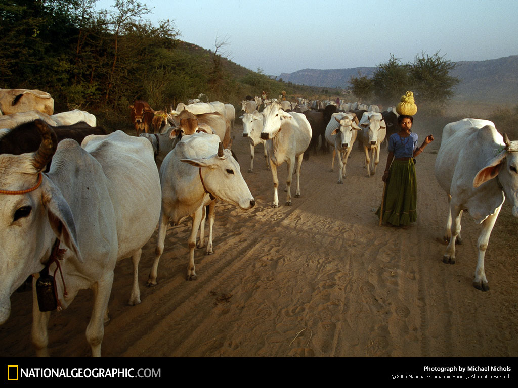 牛群正前往一个老虎保护区内的非法放牧地。土地的丧失和随之导致的野生动物的丧失,使得老虎的种群数量大大地减少。如今,没有人知道还有多少野生老虎存活,而所有的老虎物种均处于濒临灭绝的状态。