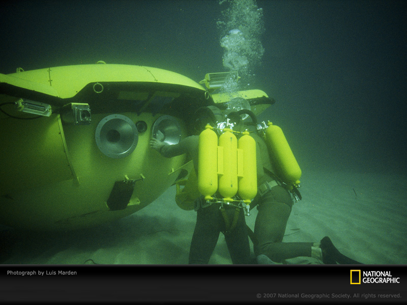 海底探险。两位法国男子潜水员,沿着海岸进入丹尼斯海域,潜入深水中接近一艘科考用的海洋船(Calypao)号。