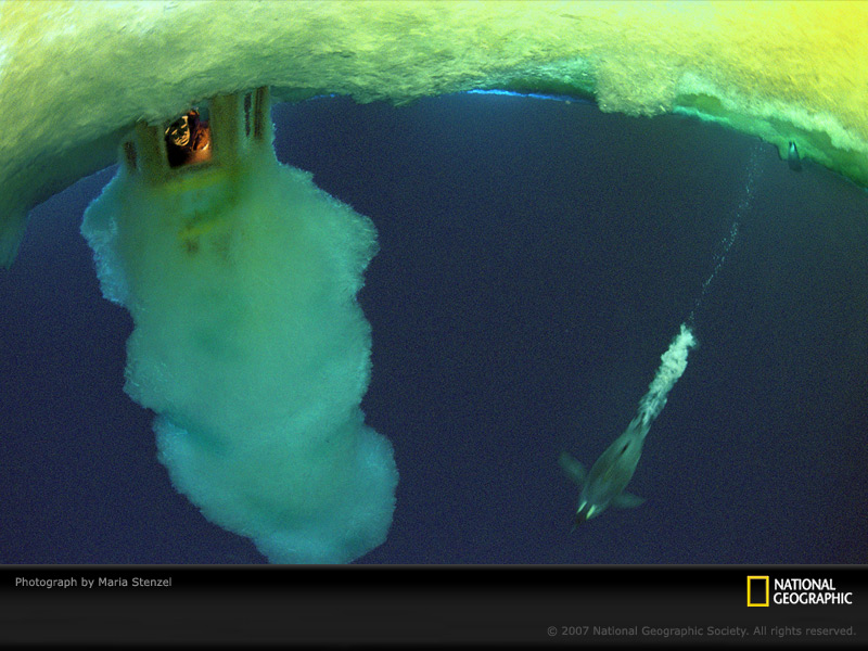 海洋下的探险。一位科学家在南极洲的海底的冰穴洞覆盖下,仔细观察皇帝企鹅的声音。