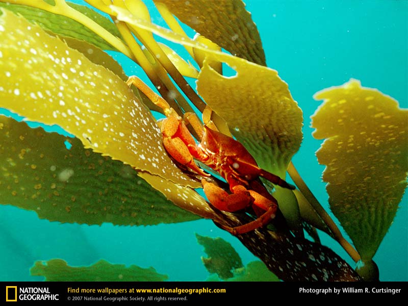 明亮红色的海藻螃蟹偎依在海藻叶片里