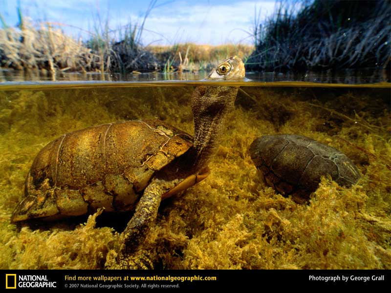 因为它的孤立和与世隔绝,中美洲的四弦吉他Cienegas的水中湿地于墨西哥的吉娃娃狗沙漠中种植独特的植物和动物,例如这些Coahuilan 盒海龟。