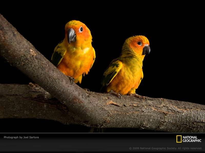 两只明亮颜色的锥尾鹦哥在一树枝上晒太阳放松自己