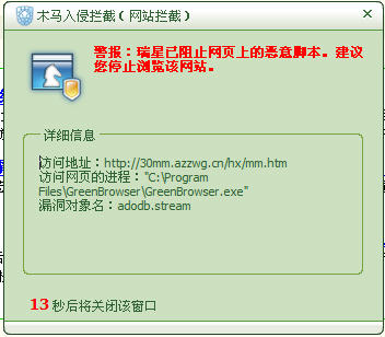 当然很多网站需要安装ActiveX控件方能正常浏览(如网银支付类、视频播放类等),这成为了我们不能完全抛弃IE的重要原因,并且对于那些不符合W3C标准的网页,IE拥有着很好的兼容性(容错性),某些在Firefox等浏览器无法正常显示的页面,使用IE则可以正常显示。ActiveX是块鸡肋,在给我们提供了丰富的扩展性能的同时,也带来了严重的安全隐患,很多病毒的传播也正是利用了第三方控件的漏洞,这时我们就需要有一款较好反挂马软件,个人认为瑞星在这方面很不错