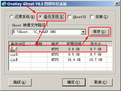 1、运行OneKey Ghost,选择“备份系统”,在下方选择要备份的分区,然后点“保存”;