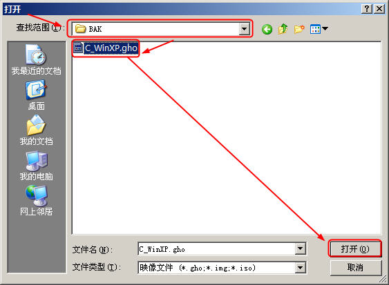 2、选择之前保存的备份文件(.gho文件),点击“打开”;