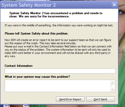 从病毒,木马,等恶意东西上仔细找过原因,似乎与那些无关;也反复查找了同机装的tiny,Kis-2009,以及ssm自身的设置与规则,及系统的组策略的设置\规则是否有冲突,但都没找到原因和解决办法,最后,只好用tiny的文件保护设了一条规则:禁止并记载任何东东对这个"shutdown.ssm"的访问\写入及删除等!结果,问题解决了一半:ssm自行挂掉的那个提示还是不时出现,不管点送不送"报告"它即退出(挂掉),但只需重点其快捷启动图标或任何途径,它又恢复如初,无需整个重装了!