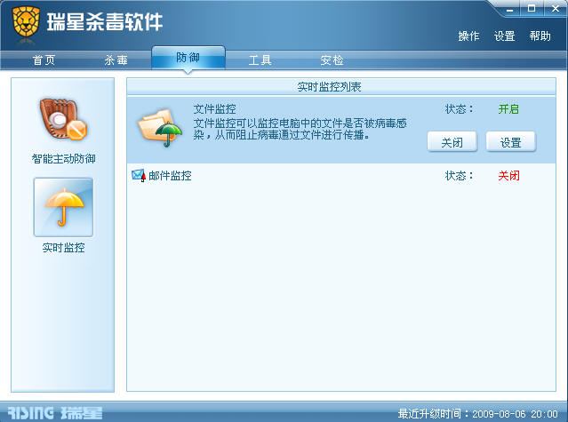 瑞星安检显示没有打开实时监控,但是在设置里面,实时监控却是打开的!