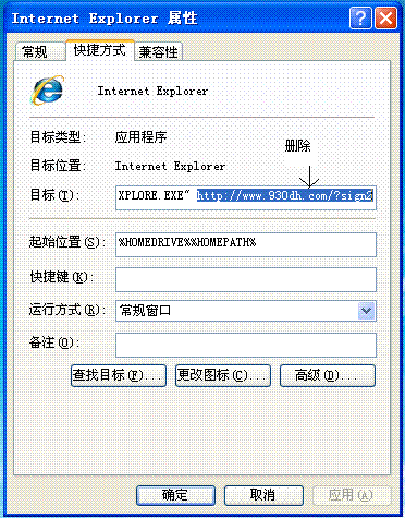 1.更改IE主页(最简单的)2.检查IE的图标(桌面上的、开始菜单里的等),右键单击它,属性,如果出现IE设置,没有问题。如果出现快捷方式设置,则(如图):如果提示拒绝访问的话,直接删掉。然后,在桌面上添加一个新的(目标、起始位置和原来的差不多,只不过没有删除掉的部分,最好起名为跟IE、浏览器无关的)并把它考到需要的地方。