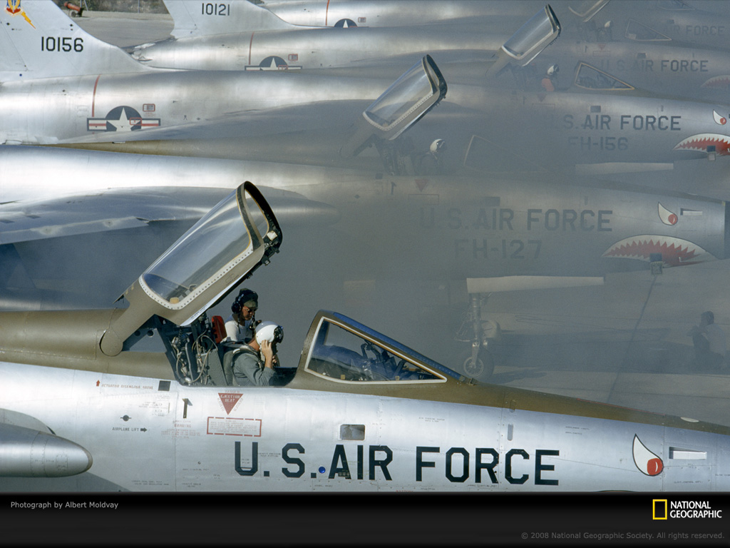一团烟雾遮盖了F-105战斗机的银色机鼻。这些飞机隶属于“飞虎”战斗机中队,在拍摄本照片的1965年,该中队正在夏威夷希卡姆空军基地(Hickam Air Force Base )执行临时任务。飞行员用黑火药来发动这些飞机那强大的引擎。