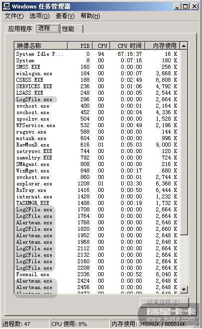 LOG2FILE.EXE 这个程序到底是什麽! 如果是没用的!请你们把他删了!真的是很烦!用了这麽久的瑞星软件!还是第一次碰到让CPU工作这麽高的程序!拜托你们!要增加或著是修改软件请你们测试完毕後再发出好吗?真的让消费者头疼和失望!
