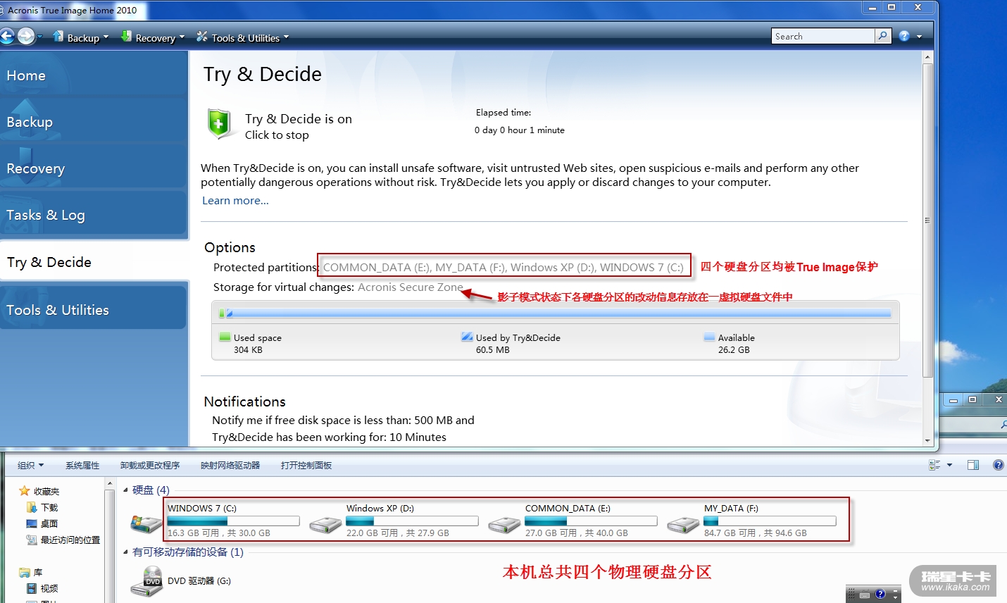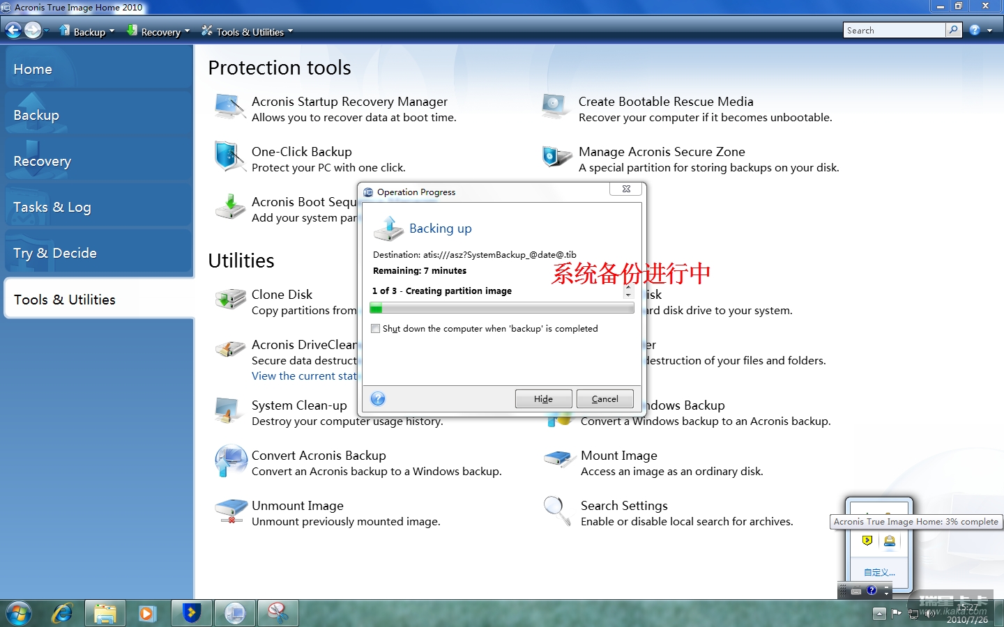 这个影子系统的特点是:如果需要,系统重启后,仍然可以继续工作在影子模式下。与 CAHIPS搭配, Acronis True Image 2010 home对于测试那些需要重启的安装软件的安全性以及病毒行为很方便。