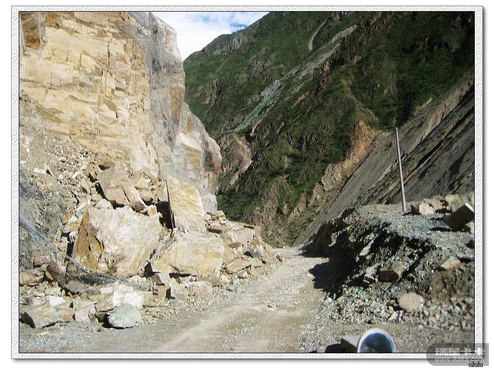 过这个塌方之后遇到广东的那几个车友刚从前面探路回来,得知前面还有两个大型塌方要扛车子过去。沿途路边“前方50米飞石不断,严重威胁过往车辆行人安全,请谨慎通行”或是“塌方堵路不经紧,切记车停安全处”的警示牌,海通沟是川藏公路上著名的地质破碎带之一,沟两侧山体极不稳定,基本由鹅卵石层和泥土层构成,一旦下雨肯定发生泥石流和塌方,十分危险,也是中央四台新闻的常见名词。在高海拔地区一边奋力骑车,一边还要抬头观察山体动静,每个人都承受着极大的心理压力,路边的崩石和塌方残留不时在提醒我们这里的危险,海通沟暗红色河水在路下翻腾汹涌,提醒我们赶快走赶快走,石头下来了就没地方跑了,累了也不敢停下休息,只是拼命往前骑车,一直到看见交通部队的施工工棚才敢停下喘口气,有他们的工棚说明至少是安全的。
