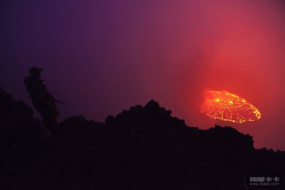 21、8月30日,刚果(金)尼拉贡戈火山口附近,一名刚果(金)的士兵在观察熔岩湖里闪着红光的岩浆。