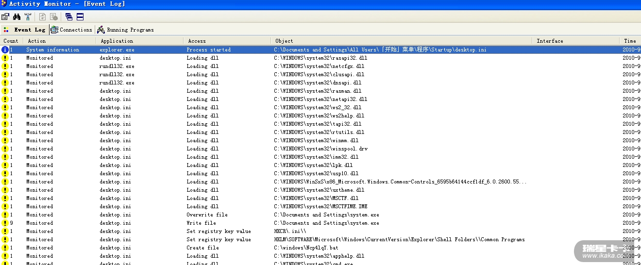 3、系统每次启动,此毒在C:\windows\目录下释放一个随机名的.bat,并即刻执行。执行后,删除此.bat。此.bat的功能是重写病毒文件c:\Documents and Settings\system.exe和c:\Documents and Settings\All Users\「开始」菜单\程序\Startup\desktop.ini;重写注册表HKCR\.ini 的键值。