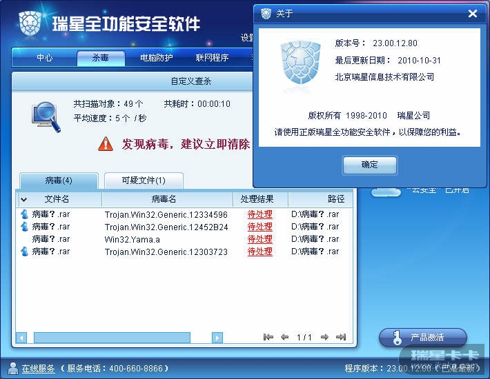 直接下载杀毒软件和防火墙的2011正式版安装包重装,升级到最新版,杀毒软件还是23.00.11.49版本,哪来的23.00.12.61版本?为什么版本还不一样呢?同样都是交了钱的用户,为什么享受的服务不一样?用这个版本查杀7楼的4个文件还是一样!文件监控也同样没有反应!