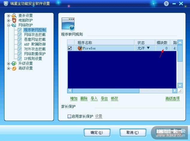 打开瑞星2011版本防火墙或全功能安全软件/设置/网络防护/程序联网控制,如图: