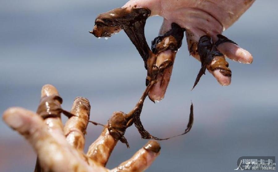 2010年6月7日,美国,路易斯安那州:海洋科学家Scott Porter手上沾满了漂浮在水面上的原油。