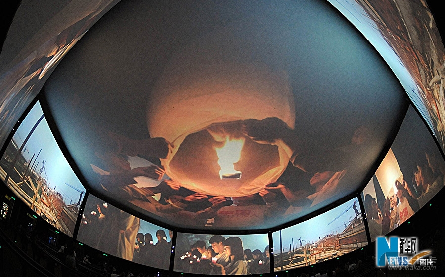 5月11日,观众在上海世博园城市生命馆环幕电影播放室内观看人们悼念“5•12”汶川特大地震遇难同胞的影像。 新华社记者 徐家军 摄