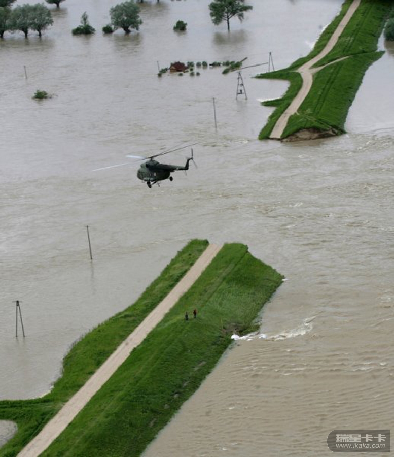 2010年5月17日,波兰政府出动直升机投掷沙包,加固已经被洪水冲毁的河堤。