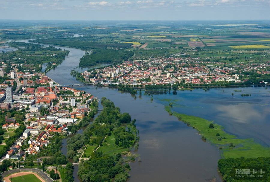 2010年5月28日,从空中拍摄的德国和波兰边界奥德河以及维斯杜拉河的洪水已经严重逼近德国,图中多处地方被淹。