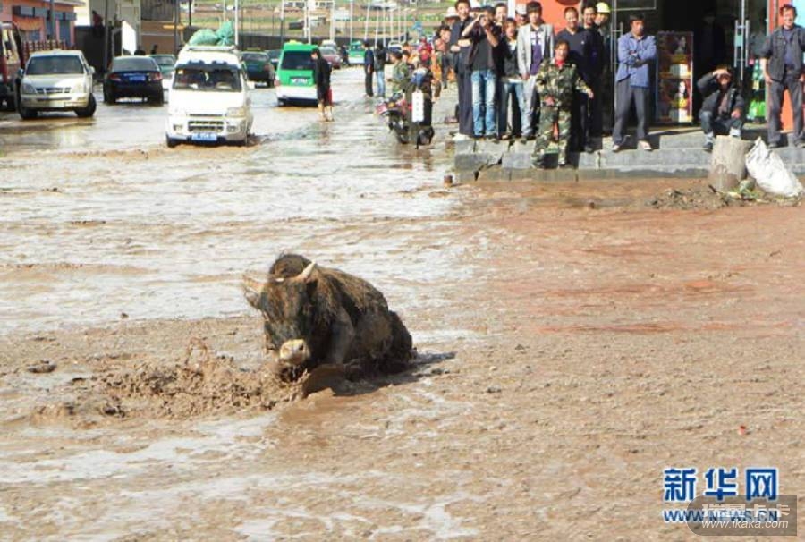 当日,青海省果洛藏族自治州玛沁县因短时暴雨引发洪涝灾害,州府玛沁县大武镇积水严重,部分路段交通中断,一些民居进水。预计未来几天,当地还会出现阵雨天气,气象部门已经发布暴雨蓝色预警。新华社发(洪卓华 摄)