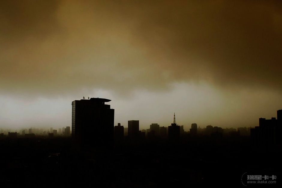 4月26日下午14时,石家庄遭遇沙尘暴袭击,沙尘伴随大风由西向东刮来,市区上空黄白分明。