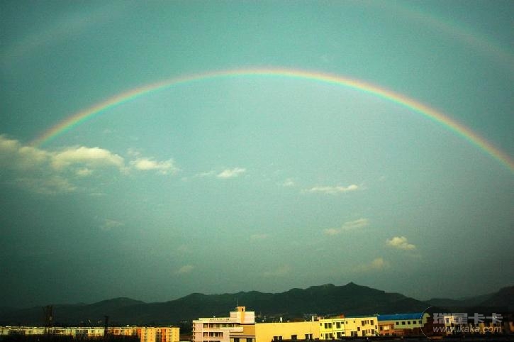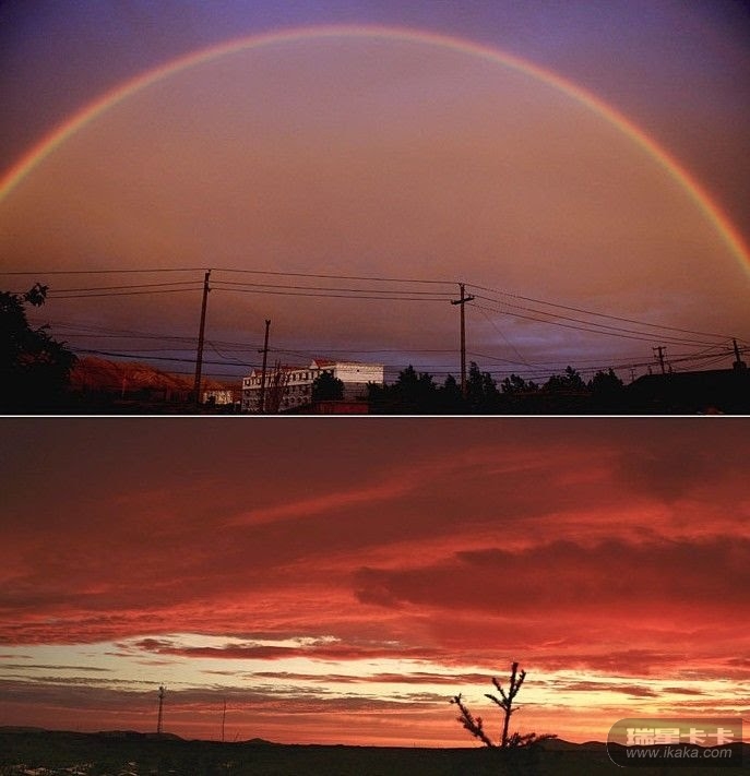 6月2日傍晚,新疆富蕴县城东边出现一道彩虹,同时西边出现壮丽的火烧云。这是彩虹和火烧云的拼图。