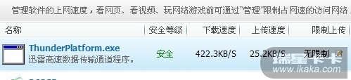 即便设置上传速度为1KB。用流量监控也能查看出来有个ThunderPlatform(应用程序)(迅雷高速数据传输通道)一直在上传,用流量监控限制了它上载速度。那么下载速度就会将下来。