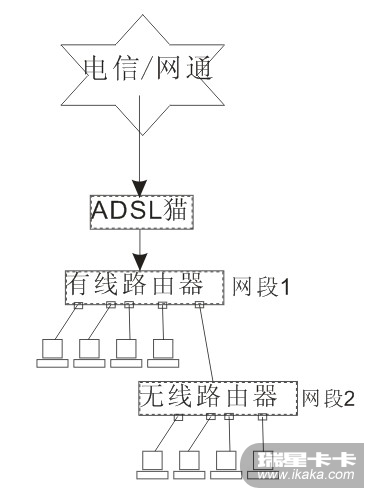 ADSL猫+有线路由+无线路由器如图(图有点丑,将就一下罢~):