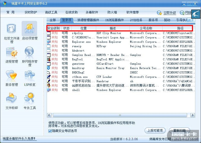 建议瑞星安全助手的“优化开机”功能,能够恢复卡卡上网助手“启动项管理”中对自启动项目的介绍。比如:安全级别、状态、位置、描述、公司名称、路径。