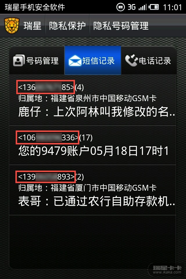 “隐私保护”——“隐私号码管理”——“短信记录”:希望能增加显示联系人名称而不是显示电话号码,这样相当不便,如下图: